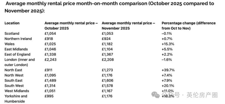 受月度上涨影响最明显的地区包括:英格兰东北部、威尔士、西南部、约克郡与亨伯赛德,以及部分中部地区,这些区域在近一个月内出现显著租金跳涨。